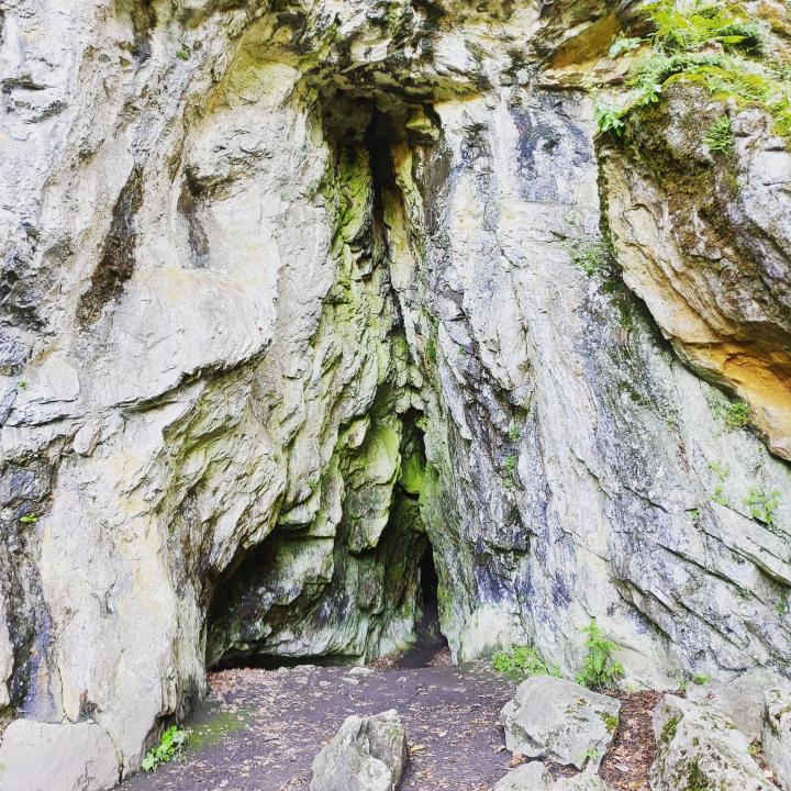 volně přístupná jeskyně Podkova (Bočkovy díry), uzavíraná v listopadu kvůli hybernujícím netopýrům, osvěžit se můžete z "Řimické vyvěračky", v dáli spatříte zámek Nové Zámky...